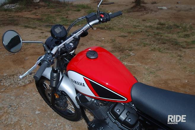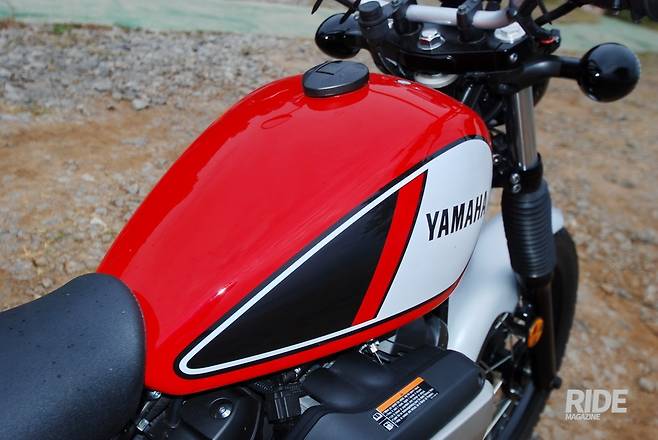 연료 탱크는 차체 크기에 비하면 아담하다. 색상이 풋풋해서 더욱 예뻐 보인다. 옆에서 보면 시트 높이와도 큰 차이가 없다. 시트 라인과 자연스럽게 연결된다. 운전자세를 잡아보면 연료탱크가 몸에 닿지 않아서 자유롭게 느껴진다. 휘발유는 13리터가 들어간다.
