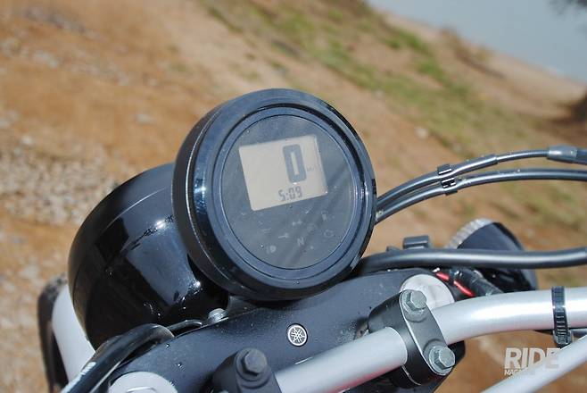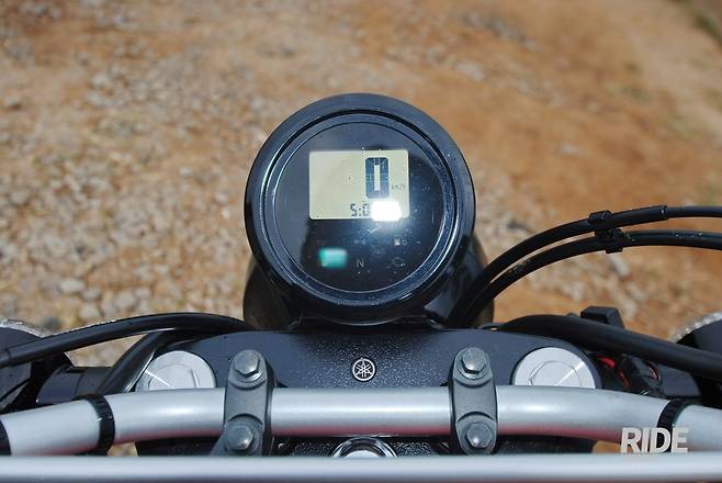 계기반은 외부적으로 원형이지만 네모난 디지털 액정에 상태가 나타난다. 속도계가 가장 크고 엔진 회전수는 안 보인다. 모드 버튼을 눌러보면 구간거리계, 시계 등 기본정보만 알려준다. 그 아래로 중립등, 상향등, 경고등 램프가 있다.