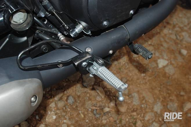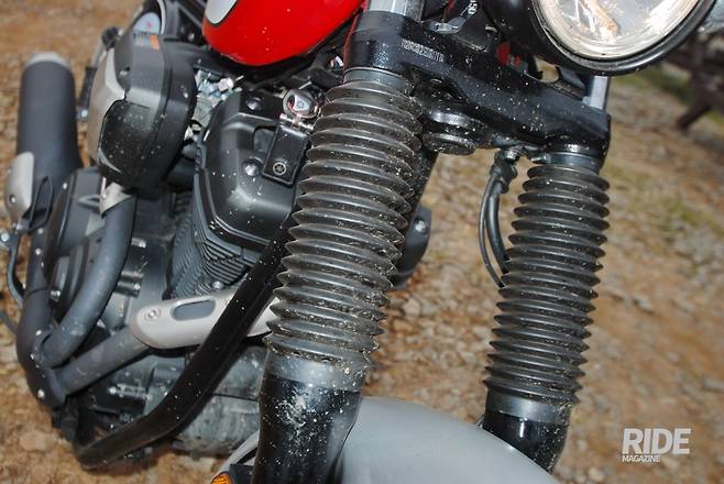 클래식 스크램블러 분위기를 물씬 풍기는 포크 부츠가 주행하면서 튄 흙먼지를 대신 뒤집어썼다. 대부분 멋인 줄 알지만 원래는 기능적인 요소가 크다.
