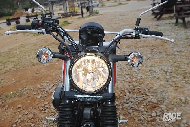 앞에서 보면 보통 크루저 혹은 네이키드 바이크같다. 원형 전조등에 원형 방향 지시등, 원형 계기반에 백미러, 제동등까지 전부 다 동그라미다.