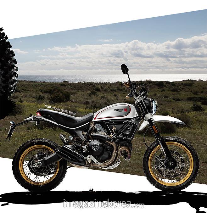 데저트 슬레드. 두카티 스크램블러의 파생모델로 그 이름은 캘리포니아 사막을 달리던 라이더들이 빠르고 재미있게 타기 위해 개조했던 모터사이클을 부르는 말이다. 그렇다고 사막에서만 타는 모터사이클은 아니니 이름만 보고 외면하지 말자. 그렇다고 흉내만 내거나 오프로드 스타일을 좇는 그런 모터사이클도 아니다. 스크램블러라는 이름을 사용하고 있지만 몇몇 부품을 빼고는 완전히 달라졌다. 오프로드용 파생모델들이 그러하듯 휠을 키우고 서스펜션을 손봤다. 프레임도 약간 바꿔 스크램블러보다 키도 더 커졌다. 특히 피렐리 스콜리온 랠리 STR 타이어는 놀라운 그립력을 보여준다. 이렇게 멋진 모터사이클을 타고 흙먼지 안으로 들어가기 망설여지는 건 어쩔 수 없다.