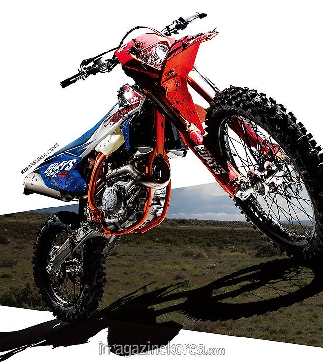 산을 올라타는 모터사이클 하면 떠오르는 건 오렌지색 KTM이다. EXC 시리즈는 오프로드를 달리는 엔듀로 경기를 위한 모델이다. 450은 배기량, 뒤에 붙은 F는 4스트로크를 의미한다. 오프로드 경험이 없다면 450이라는 배기량이 그리 대단할 게 없어 보이지만 오프로드에서 450cc는 온로드의 리터급 슈퍼바이크보다 강력하다. 거기에 무게가 고작 113킬로그램밖에 되지 않는다. 껑충한 차체에 타는 과정부터 모터사이클로 산을 정복하는 기분이다. 스트로크가 긴 서스펜션과 깍둑썰기를 한 타이어는 어떠한 지면에서도 딱 달라붙는다. 심지어 점프 후에도 안정적으로 착지해 바닥에 붙는다고 하니 KTM을 믿고 산으로 가자.