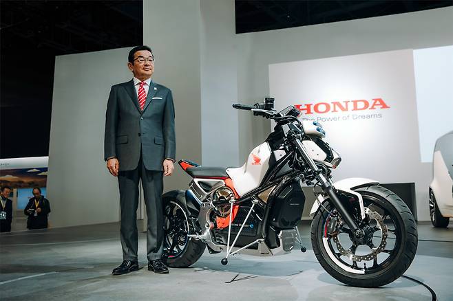 혼다 라이딩 어시스트-e를 소개하는 혼다의 하치고 타카히로 사장, 라이딩 어시스트는 프론트 휠을 돌려서 균형을 유지한다.