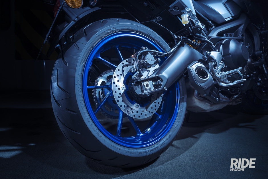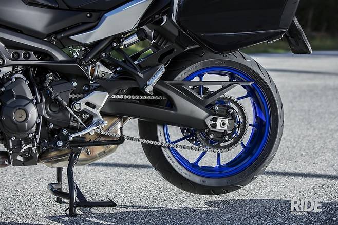 경량 10개의 스포크를 가진 휠은 푸른색이다. 또한 시트를 자세히 보면 봉제선이 파란색 스티칭으로 마무리되어 야마하 특유의 스포츠 블루 컬러가 드러나고 있다. 블랙 컬러의 핸들 바, 레버는 MT-09 SP의 고품질 느낌과 잘 어울린다. 별도의 드레스업이 불필요한 컬러 매칭이 과연 스탠다드와 다른 고급 사양임을 드러내고 있다.