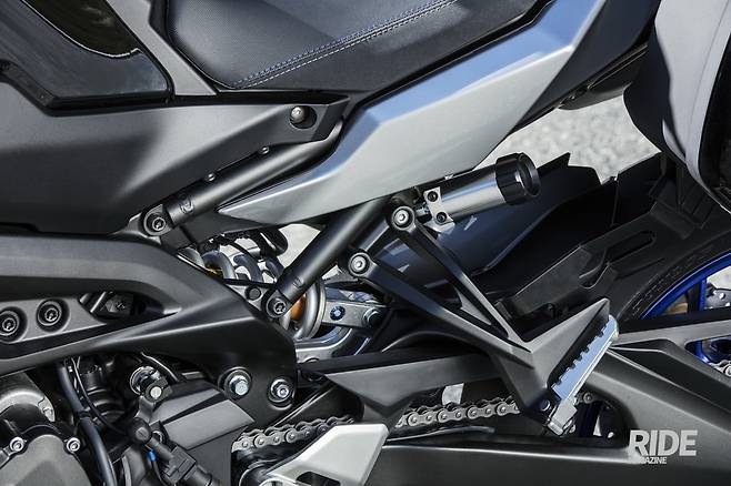 다시 MT-09 얘기를 해보자. 직렬 3기통 엔진은 토크가 풍부한 크로스 플레인 필로소피에 의해 탁월한 스포츠 성능을 가지고 있다. 여기에 더 높은 트랙션 성능을 만들기 위해 SP에는 올린즈 리어 쇽 업소버를 기본으로 장착해 리모트 컨트롤을 이용한 쉽고 정밀한 조절 기능을 제공한다. 라이더는 설정을 수시로 미세하게 조정하고 핸들링 성능이나 제어 성능을 자신에게 맞출 수 있다.