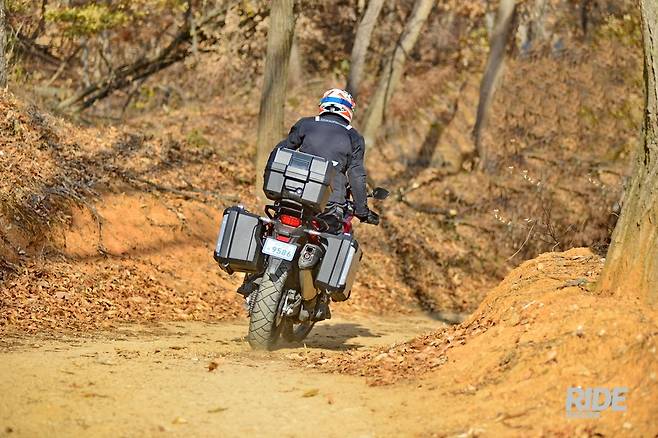 이정도 사이즈의 빅 엔듀로 투어러는 흙 위에서 저속으로 방향을 바꾸거나 유턴하는 것이 부담스럽기 마련인데, 아프리카 트윈은 저중심 설계에 차폭이 갸름해서 생각외로 부담이 적었다. 이 또한 DCT 버전보다도 한층 가볍게 운용하기 편하다고 느꼈다. 줄어든 10kg의 차이가 단순 수치의 문제는 아님을 느꼈다. 아직은 매뉴얼 기어가 더 익숙하기 때문에 심적으로 더욱 그렇게 느꼈을 지도 모른다.