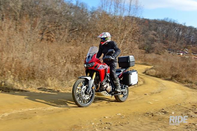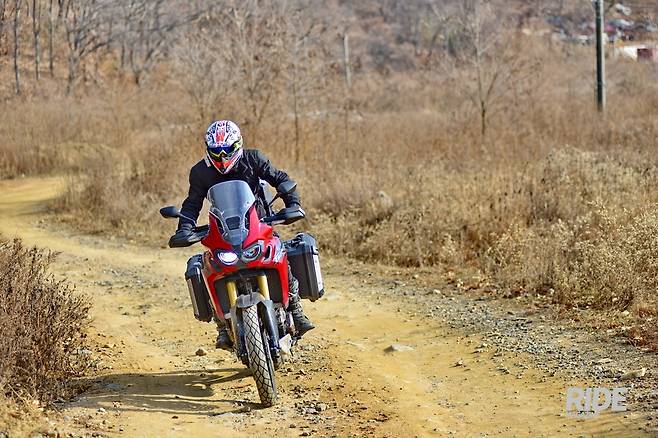 엔듀로 투어러를 지향하는 모델인만큼 평탄한 오프로드를 속도내어 달려봤다. 겨울이 되어서 제법 노면이 미끄럽고 진흙탕은 얼어붙은 곳도 있었지만 아프리카 트윈은 염려하지 않고 달려나갔다. 직경 45mm의 도립 포크는 230mm의 긴 작동길이를 가지고 있는 본격적인 오프로드 대응 서스펜션이다. 리어 또한 작동길이는 220mm나 된다. 사용자 기호에 따라 압축력, 신장력, 초기하중 모두 조절이 된다.