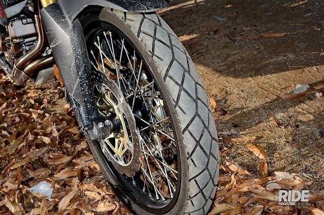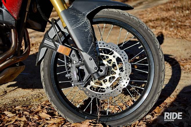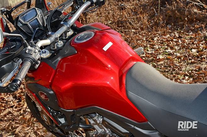 이번에 우리가 시승한 MT 버전은 DCT 버전의 차체 중량 245kg에 비해 10kg 가벼운 무게다. DCT 버전 기준으로 G스위치나 파킹 브레이크가 생략된 점을 제외하면 전반적으로 동일한 제원을 가지고 있었다. 즉 같은 바이크다. 시승차량 색상은 레이서 데칼이었던 DCT 버전의 기존모습보다 훨씬 차분한, 은은하게 빛나는 레드 컬러였다. 가격은 DCT 버전 대비 150만원이 차이 난다. 분위기는 비슷한데 컬러 덕분에 좀 더 온화해 보였다. 전륜 휠은 21인치 90/90 사이즈로 튜브타입이고, 뒤는 150/70 사이즈의 18인치 휠을 기본으로 한다. 키가 크고 늘씬한 이미지는 그대로다.