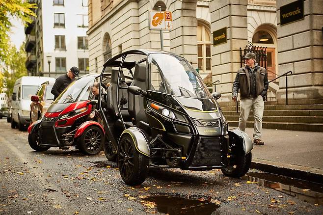 앞에는 두 개, 뒤에는 하나의 바퀴로 이뤄진 SRK는 바이크와 자동차 사이에 포지션 한다. 두 개의 시트가 앞·뒤로 배치되어 둘이 타거나 짐을 옮길 수 있고, 100% 전기로만 구동된다.![]()