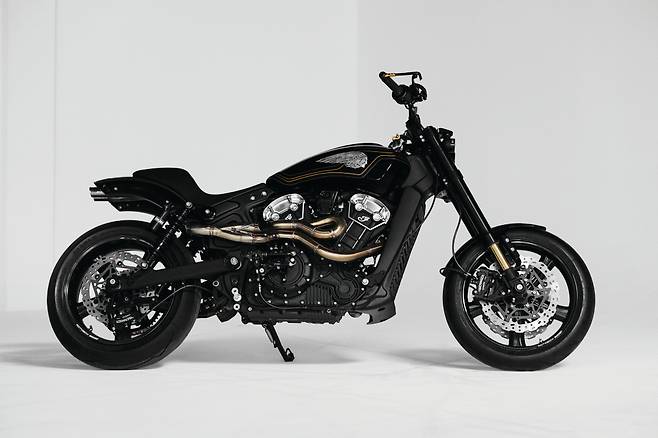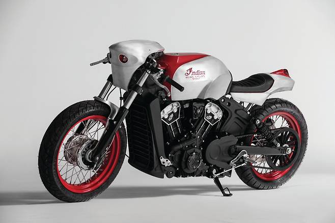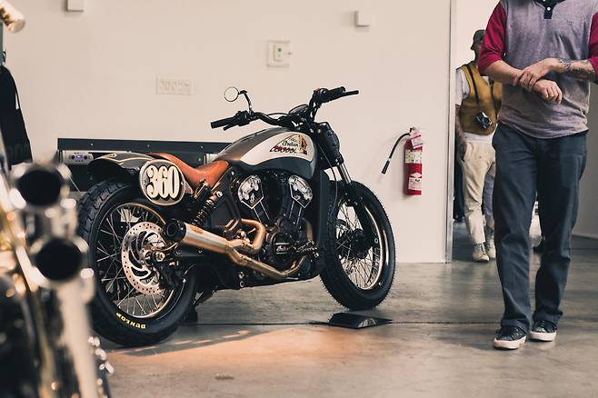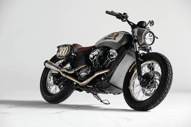 전설의 스케이트 보더인 스티브 카발레로와 최근 커스텀 모터사이클 신에서 눈에 띄는 활약을 보이는 롤랜드 샌즈가 인디언 스카우트 바버를 새롭게 만들었다. 올해 인디언 모터사이클이 제패했던 플랫 트랙 레이스에서 영감을 받아 스트릿 플랫 트래커 스타일로 제작되었다. 트래커 스타일에 핸들바와 플랫 트랙 타이어를 사용하고 카바렐로를 상징하는 숫자 360이 적혀있는 넘버 플레이트를 달아 플랫 트랙 레이스 바이크의 모습을 갖췄다. 또한 도심 주행을 위한 헤드라이트와 프런트 브레이크는 그대로 유지했다. 대부분의 파츠들은 롤랜드 샌즈가 작업에 참여하면서 RSD의 제품들로 이뤄졌다. 커스텀 바이크 임에도 깔끔한 마감이 느껴진다. 특히 페어링부터 탱크, 리어 펜더까지 이어지는 핀스트라이핑과 인디언 로고 페인팅이 멋지다. 지금 당장이라도 플랫 트랙을 달릴 수 있을 정도로 완성도가 높다.
