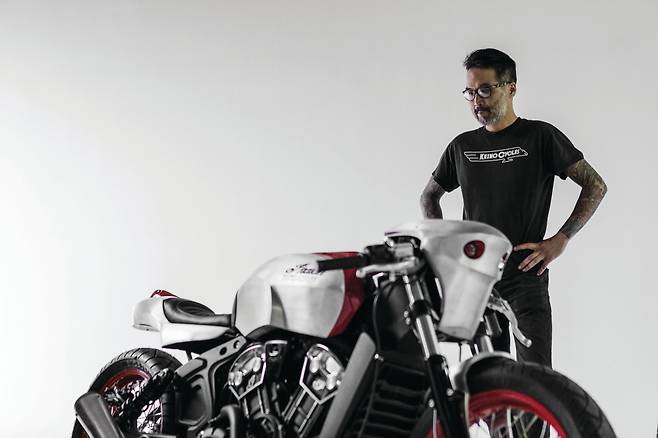 케이노 사사키는 뉴욕 브루클린에 위치한 케이노 사이클의 대표이자 빌더로 브루클린 모터사이클 전시의 메인 멤버 중 하나다. 그는 1950년대에서 60년, 70년 사이 제작된 스트림라이너 열차와 항공기, 차량에서 영감을 받아 스카우트 바버를 커스텀했다. 모델의 이름은 스트림라이너이며 이름과 같이 공기를 가로지르는 디자인의 페어링이 인상적이다. 알루미늄을 가공해 직접 제작한 연료탱크와 페어링, 시트 펜더는 사진으로도 마감이 느껴질 정도로 완성도가 높다. 또한 알루미늄 머플러와 와이어 스포크 휠을 적용해 클래식함을 더했다. 거친 느낌의 알루미늄과 붉은 색의 포인트 페인팅이 미래적이면서도 빈티지한 느낌을 동시에 가져다준다.