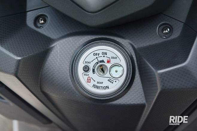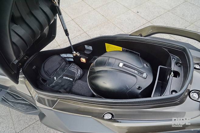 편의장비를 더 살펴보면, 시트 아래의 넓은 수납공간을 말하지 않을 수 없다. 풀페이스 헬멧이 두 개 수용되는 이 공간은 활용도가 좋다. 가운데에는 트렁크 내부를 비추는 조명도 마련되어 있고, 무겁고 넓은 시트의 쉬운 개폐를 위해서 댐퍼가 달린 지지대가 설치되어 있다.