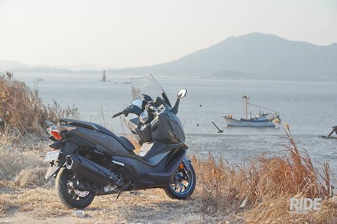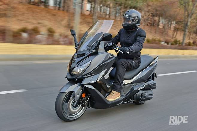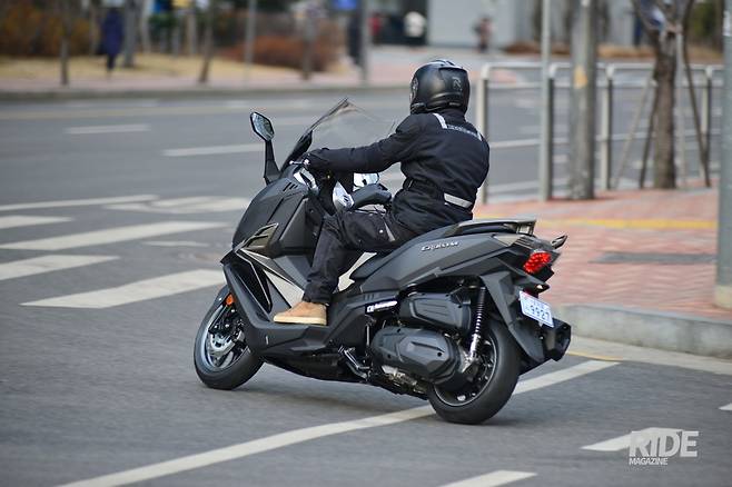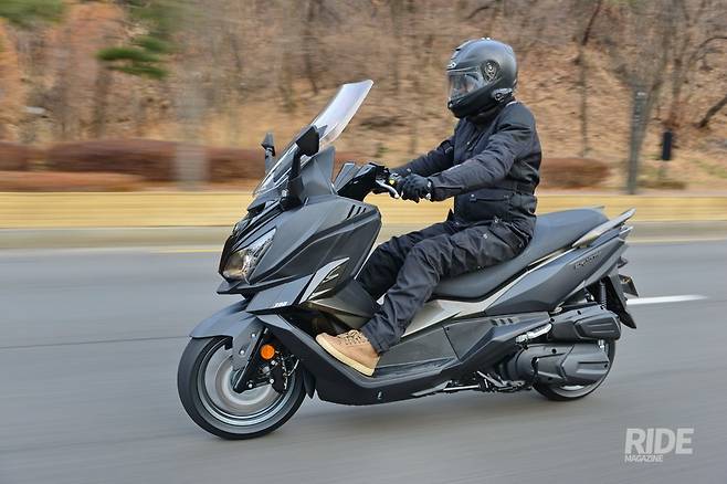 스포츠 주행성도 특출나지 않지만 쓸만했다. 스쿠터의 한계만 감안한다면 스포츠 투어링 정도는 충분히 즐길 수 있으며 단기통 엔진 설계답게 차체 또한 코너링 시 기울이는 과정이 매끄럽고 경쾌하다. 애초에 출력이 과하지 않으므로 한겨울 영하의 노면 위에서도 불안감도 없고 움직임에 자신감이 넘친다.