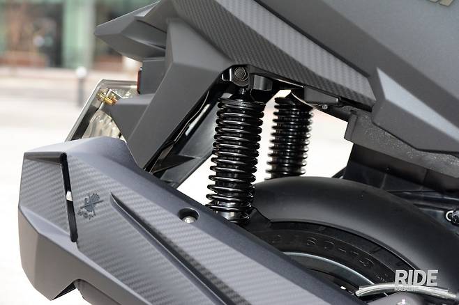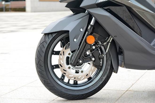 타이어는 앞 120mm 폭에 14인치 휠을, 뒤 140mm에 13인치 휠을 사용한다. 저속, 고속 할 것 없이 안정감있는 주행성을 보여줬다. 듀얼 리어 쇽이 적용된 뒷 서스펜션은 저속에서 방지턱을 넘는 등 요철을 통과할 때 스프링 반발력이 강해 조금 불편했으나, 고속으로 주행할 때는 단단하게 느껴졌고 출렁대지 않아서 좋았다.