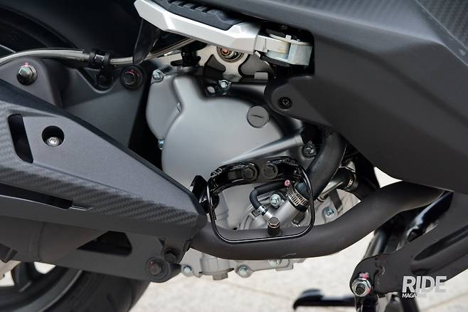 시트가 낮음에도 발판과의 단차 높이가 짧지 않아 라이딩 자세가 매우 편안했다. 엔진은 1,500rpm 정도에서 대기하고 있다가 스로틀을 돌리면 슬슬 전진하는데, 300cc급 단기통 치고는 진동과 소음이 크지 않았다.