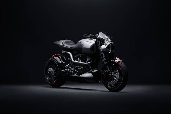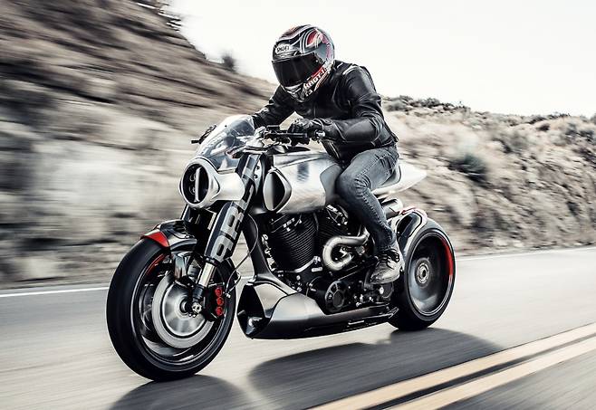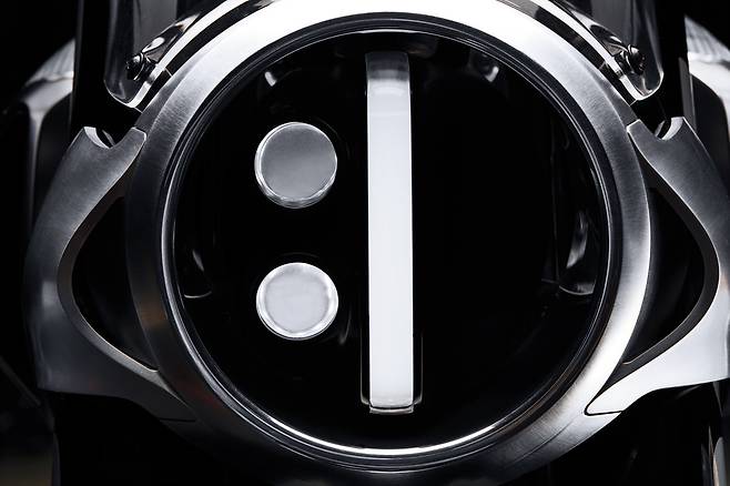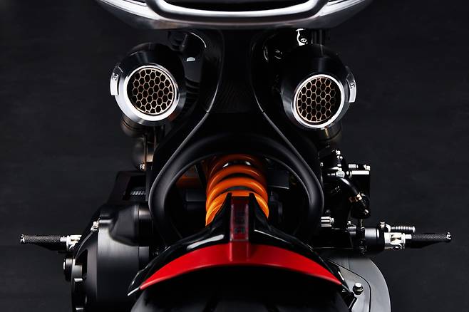 미래에서 온 듯한 파격적인 디자인의 풀 LED 헤드램프를 비롯해 파츠 하나하나를 깎고 갈아 만들며 수제작 느낌을 시각적으로 강조했다. 시트와 연료탱크 상단 등 라이더와 만나는 부분엔 최고급 가죽을 덧댔다. 뱀처럼 똬리를 튼 배기 파이프는 모토GP 머신에서 영감을 얻어 티타늄, 카본 파이버, 알루미늄을 부분적으로 조합해 완성했다.![]()