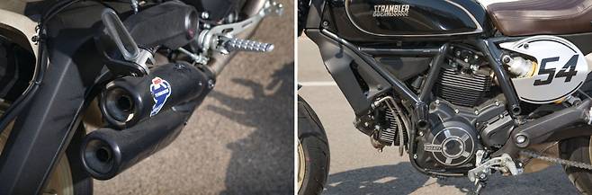 바엔드 미러는 전체적인 실루엣을 낮춰준다. 반면 부착된 높이 때문에 승용차의 사이드미러 높이와 비슷해 주의가 필요하다. 마스터 실린더의 리저브 탱크가 별체식으로 변경된 점도 좋다. 스크램블러 특유의 배기 라인은 여전한데 L트윈 레이아웃의 각 실린더에서 역동적으로 감겨 차체 하단으로 이어지며 두 가닥으로 빠진다. 순정이 떼르미뇨니가 달려있으며 블랙 파우더 코팅 처리되어 심플하게 차체와 어울린다. 전반적으로 블랙 위주의 컬러에 포인트가 되는 골드, 넘버 플레이트의 실버가 조합되어 시크하면서도 기계적인 느낌이 좋다. 연출된 파츠의 디자인과 마감 수준 모두 슬쩍 보기에도 완성도가 무척 높다. 사소한 것 하나가 바이크 전체의 인상을 좌우하기에 높은 점수를 줄 수 있다. 옥에 티를 하나 꼽자면 다른 파츠에 비해 눈에 띄게 못생긴 벌브 타입 방향 지시등 정도랄까.
