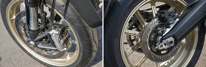 보디워크만 카페레이서를 따라 한다고 해서 진정한 카페레이서가 될 수는 없는 법. 스크램블러 카페레이서는 이 지점을 명확하게 파악했다. 프런트 휠을 17인치로 변경해 스포츠 타입 바이크에서 주로 사용하는 전후 17인치로 휠 세팅을 변경했다. 휠 크기 자체에서 느낄 수 있는 스포티한 핸들링과 선회가 마음에 든다. 또한 전후 17인치 사양은 타이어 선택 폭이 넓어 추후에 라이더의 취향에 따라 취사선택하기 용이한 이점이 있다. 순정 타이어는 피렐리 로쏘Ⅱ 타이어가 장착되는데 과격한 주행에도 쫀쫀한 그립을 만들며 라이더의 의지대로 바이크를 조향하기 좋았다. 노멀 스크램블러의 블록 패턴 듀얼 타이어에 비해 시각적으로도 스포티한 분위가 풍기는 점도 눈길이 간다.