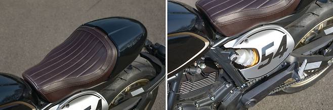 시트는 패턴을 잘게 나눠 시각적인 리듬감에 굵은 스티치가 포인트가 된다. 동승자 승차가 가능한 2인용으로 뒷자리의 캐노피는 시트하단의 전용 공구로 탈착 할 수 있다. 은은한 광택이 돋보이는 실버 컬러의 넘버 플레이트가 멋지다. 숫자 54는 브루노 스파찌아리(Bruno Spaggiari)의 재킨 넘버로, 그는 1968년에 스크램블러 350 엔진을 얹은 바이크로 레이스에 출전한 전설적인 레이서다.