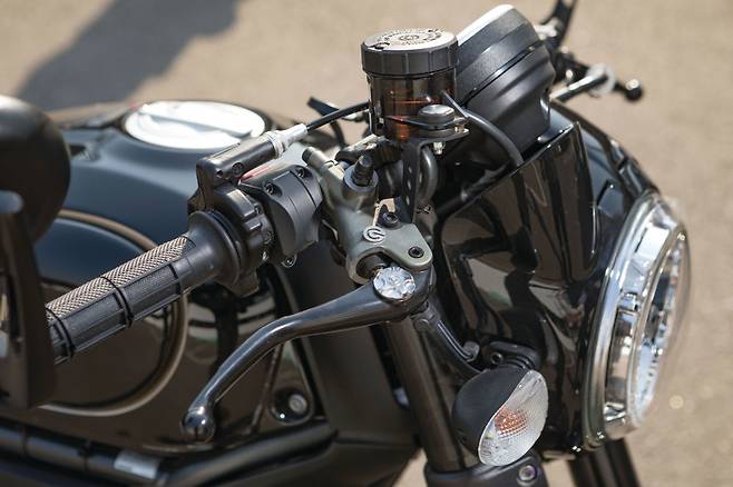 이번에 시승한 스크램블러 카페레이서는 클래식 장르에서 한 영역을 구축하고 있는 커스텀 카페레이서를 적극적으로 연출했다. 특징적으로 낮은 핸들바와 리어 시트 캐노피가 적용된 시트가 인상적이다. 핸들바는 전용 브래킷으로 포크에 고정되는데 탑브릿지 위로 슬쩍 올라와 과하게 수그리는 자세가 연출된다.