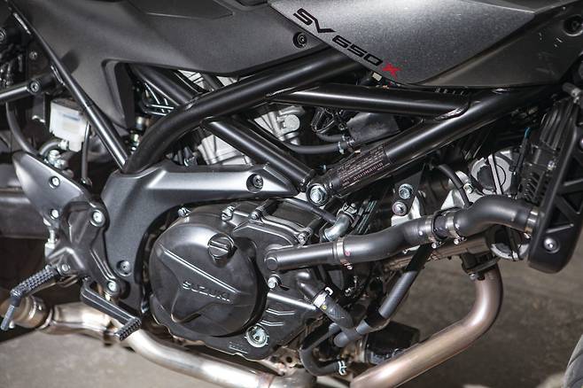 이러한 기분 좋은 달리기에는 엔진의 역할도 크다. 90년대부터 꾸준한 개량을 거쳐 이어지는 645cc의 V트윈 엔진을 사용하고 있다. 현행 V스트롬 650에도 사용되는 엔진이다. 우려낸 정도는 사골에 가깝지만 그만큼 잘 숙성된 엔진 이라는 것도 사실이다. 예전 엔진을 그대로 쓰는 것이 아니라 꾸준히 최신기술을 접목해 개량한 것이다. 두 개의 버터플라이 밸브가 장착된 스즈키 듀얼 스로틀밸브를 채용하고 저회전에서 자동으로 회전수 보정으로 시동이 꺼지지 않게 도와주는 로우 RPM어시스트가 있어 출발과 저속에서 스트레스를 줄이고 바이크를 다루기가 쉽다. 고전적인 케이블 방식임에도 스로틀 반응이 꽤 민감한 편이다. 부드럽게 달리려면 그만큼 스로틀 조작을 섬세하게 해야 한다.