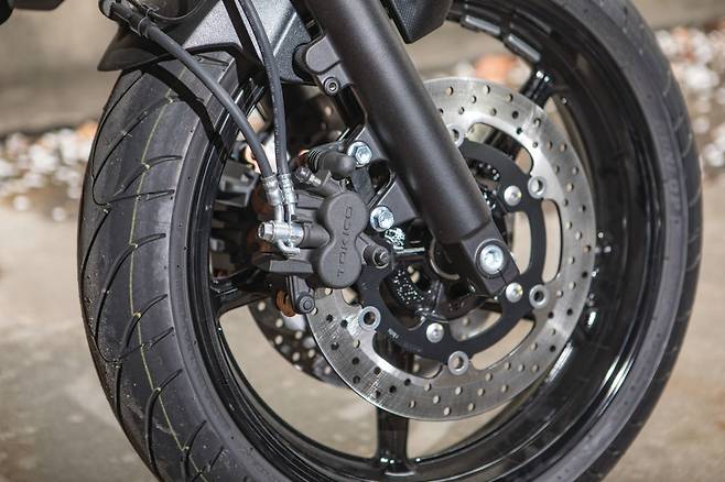 브레이크는 더블디스크에 2피스톤 캘리퍼를 채택하고 있는데 바이크가 가벼운 덕분에 필요충분한 제동력은 내주지만 탠덤을 하거나 고속 주행시에는 조금 밀리는 느낌이다
