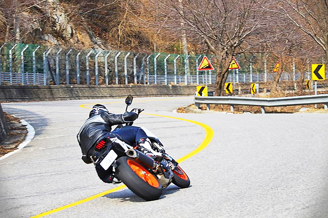 본격적인 시승을 위해 시내를 벗어나는 시간은 약 오후 2시가 넘어서였다. 아무래도 교통 상황이 좋지 않았기에 슈퍼 듀크 R을 충분히 테스트하기엔 부족하다고 생각했다. 그리고 아무래도 덩치도 크고 출력도 높으니 시내에서 불편을 감수해야 할 것으로 예상했었다. 어쩌면 당연한 일이겠지만, 시내 주행에서 단점이 좀 드러날 수 있겠다고도 봤다. 하지만 이번에도 예상과는 달랐다. 장비 중량이 거의 200kg에 가까운데도, 시트고가 높은데도, 덩치가 작지도 않은데도 시내 교통 흐름에서 전혀 뒤쳐지지 않는다. 저속에서의 방향 전환성도 무척 편안하고, 충분히 강력한 엔진이지만 전혀 신경질적이지 않다. 물론 급격하게 스로틀 그립을 잡아비틀면 여지없이 프론트 서스펜션이 들썩거리지만, 전혀 불안하지 않았다. 시내를 벗어나기 전에 단점을 찾아보고자 했던 노력은 수포로 돌아갔다. 이제 막 시승을 시작하는 순간이었지만, 인정할 수 밖에. 선입견을 가지고 슈퍼 듀크 R에게 미안하다고 고백할 수 밖에 없었다.