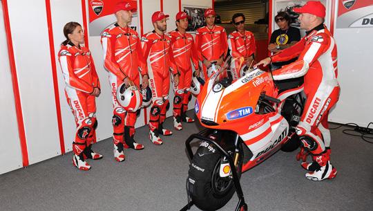 레이스 레전드 랜디 마몰라가 월드 두카티 위크에서 탠덤 주행에 대한 설명을 하고 있다. 팔꿈치와 무릎이 자연스럽게 구부러져 있는 것을 잘 볼 수 있다.