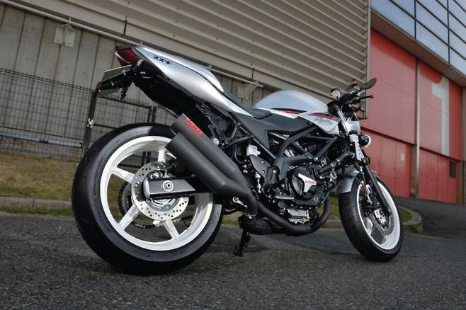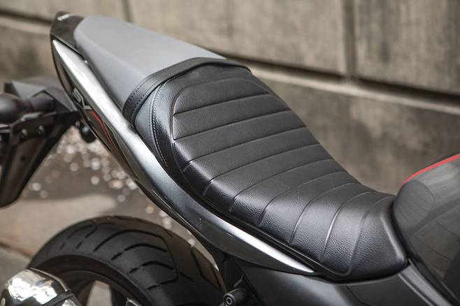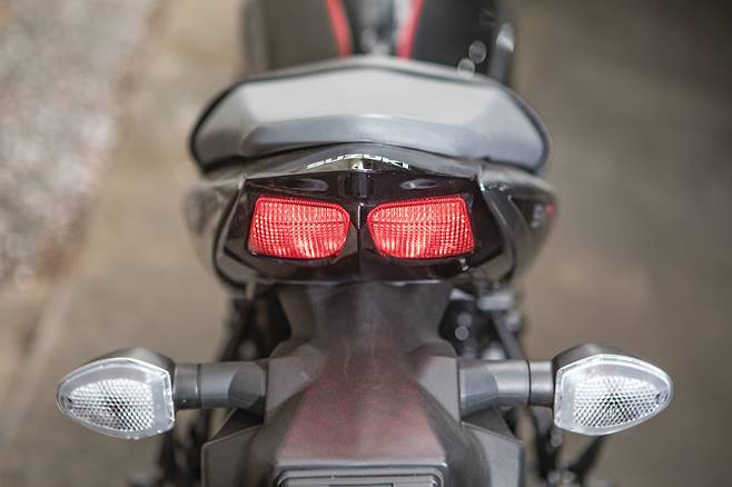 확실한 변화가 느껴지는 프런트에 비해 리어에는 변화가 거의 없다. 터큰롤 시트가 적당히 분위기를 돋우는 포인트가 되긴 하지만 SV650의 스타일에서 크게 벗어나진 못하고 있다. 시트는 뒤쪽이 높아지는 전형적인 스포츠 네이키드 스타일이다. 시트를 투톤으로 처리했는데 탠덤좌석 쪽이 바디 컬러와 일체화되어 얼핏 캐노피를 씌운 것 같이 보인다. 그밖에는 컬러링 정도의 차이로 큰 변화는 없다. 와이어 스포크 휠을 끼웠다면 더 근사했을 것 같다는 생각은 들지만 지금 순정 휠도 디자인과 밸런스는 나쁘지 않다.