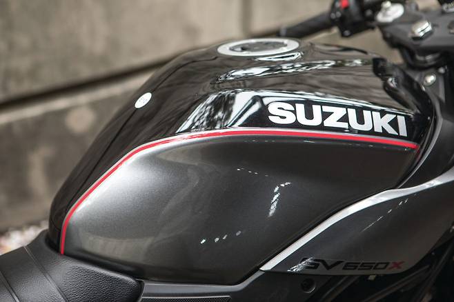 사진보다 실물이 훨씬 낫다는 건 이 바이크를 보는 사람들의 공통적인 의견이다. 담백한 디자인의 베이직 모델인 SV650과 달리 SV650X는 밀도 있는 디자인으로 시선을 끈다. 커스텀 빌더의 손에서 탄생한 것 같은 독특함이 있는데 기본적으로 콘셉트 모델인 SV650 랠리의 디자인 요소를 그대로 가져왔다. 메탈릭 그레이 컬러와 블랙의 조화가 묵직함을 더한다. 가느다란 레드 라인이 포인트가 되며 블랙 바탕에 새겨진 스즈키 로고가 선명하다. 헤드라이트 위에 작은 비키니 카울을 씌웠지만 연료탱크 좌우에 덧대진 카울로 라인이 이어지며 프레임 마운트 된 페어링처럼 보이도록 연출했다.