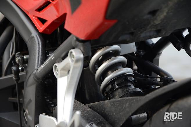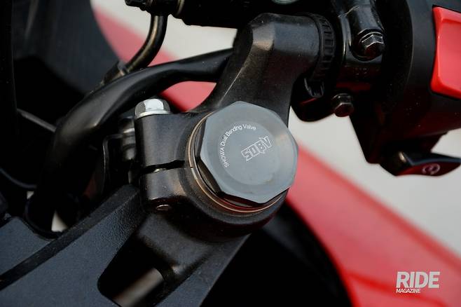 쇼와 듀얼 밴딩 밸브(SHOWA Dual Bending Valve)는 앞 서스펜션의 움직임을 보다 안정적으로 유지해주며 특히 고속에서 효과가 톡톡히 발휘됐다. 전후 서스펜션 움직임은 부드러우며 저속부터 풀 가속, 혹은 최고속도에서 풀 감속을 할 때도 크게 균형을 잃지 않고 하중을 받아준다. 턴이나 재가속 등 바로 다음 액션을 취해도 불안하지 않은 움직임은 라이더로 하여금 매우 신뢰를 느끼게 해준다.![]()