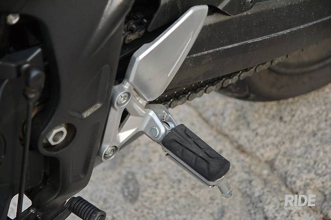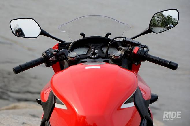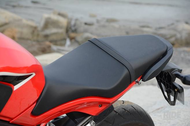 스포츠 라이딩에 필수적인 힐가드는 널찍하고 발판에는 발바닥으로 전달되는 진동 흡수용 고무가 덧대여 있다. 핸들에 부착된 기본적인 스위치들은 조작감이 무난하며, 비상등이나 패싱(일시상향 경고등) 스위치도 기본으로 구성되어 있다. 프레임 양쪽으로는 차량 홀딩을 돕는 니그립 패드가 장착되어 있고 백미러는 프론트 페어링에 붙어 낮은 프론트 라인을 유지하면서도 후방 시야를 무난히 확보했다.![]()