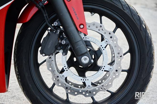 앞 브레이크는 양쪽으로 디스크가 달려있고 각 2포트 캘리퍼에 물린 전형적인 보급형 스포츠 바이크의 형태다. 정립식 포크와 더불어 본격적인 고성능 파츠가 아닌 부분에 대해 대부분 사람들이 아쉬워하지만, 100마력 아래의 파워를 내며 일상에서의 스포츠를 추구하는 이 모델에게는 충분한 성능을 보인다. 이 이상 파츠를 장착해 비용은 물론 중량을 올려 부담을 늘릴 이유가 없는 것이다.![]()