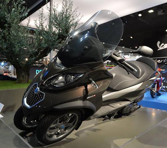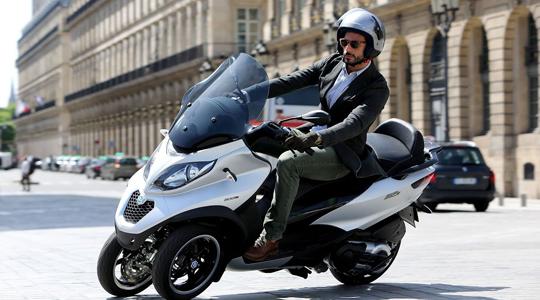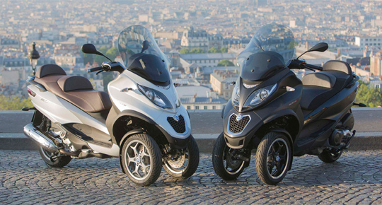 이탈리아의 거대 스쿠터 제조회사 피아지오가 2006년에 발표한 MP3는 지금까지 3륜 바이크의 상식을 깼다. 앞바퀴를 두 개로 만들었기 때문이다. 나란히 장착된 두 개의 앞바퀴는 일반 바이크처럼 차체가 기울어지면서 코너를 돌게 만들었다. 서스펜션을 잠그는 틸팅 기능이 들어가 정지 상태에서 라이더가 발을 내려 중심을 잡지 않아도 되게 만들어졌다. 이 잠금 기능은 수동으로 작동 시키며 엔진 회전수가 올라가면 자동으로 풀리게 된다. 이로써 라이더는 발을 전혀 땅에 대지 않고도 목적지까지 갈수 있게 되었다.
