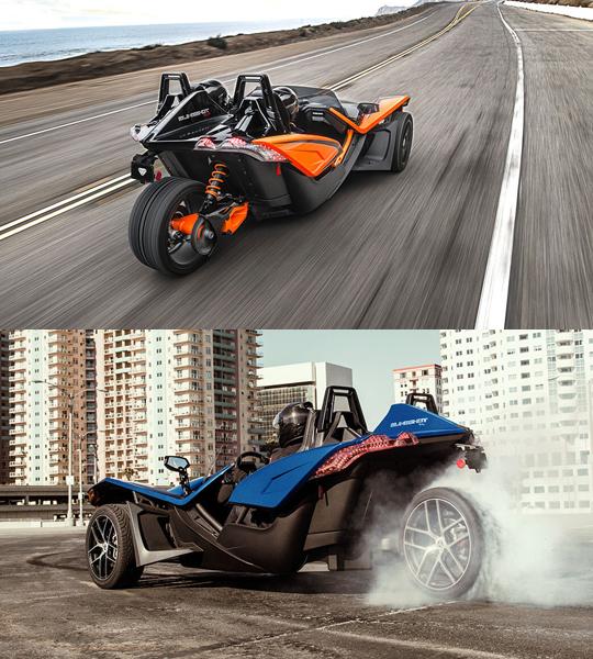 2014년에 처음 발매된 폴라리스의 슬링샷. 미국의 폴라리스는 오랜 시간 ATV를 비롯해 빅토리 모터사이클을 만들어왔다. 캐나다의 BRP와 경쟁구도에 있기 때문에 슬링샷은 스파이더보다 더 재밌고 안정적이여야만 했다. ATV에서 변형된 UTV를 잘 만들어왔기 때문에 그 기술을 많이 투입했다.