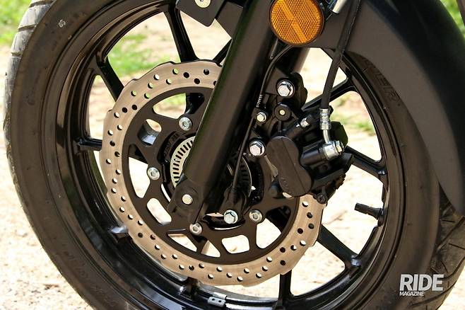 브레이크는 무난하게 작동한다. ABS가 기본 장착되어 있지만 아무 때나 발동되지는 않고 한계가 적당히 높다. 앞/뒤 모두 싱글디스크 타입이다.